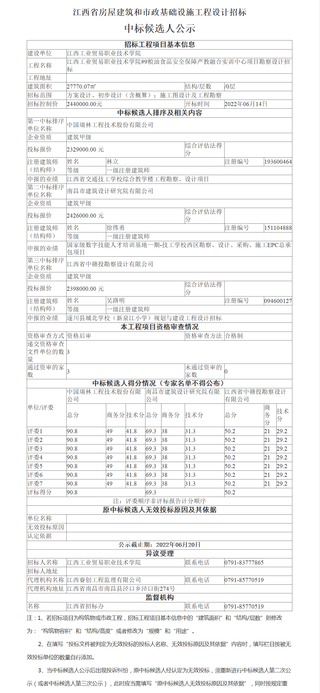 江西工業(yè)貿(mào)易職業(yè)技術(shù)學(xué)院#9糧油食品安全保障產(chǎn)教融合實(shí)訓(xùn)中心項(xiàng)目勘察設(shè)計(jì)招標(biāo)[中標(biāo)候選人公示]