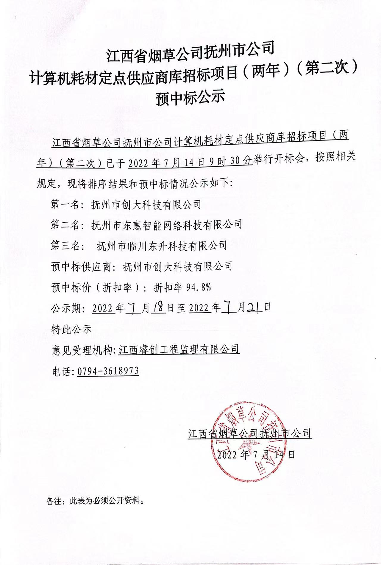 江西省煙草公司撫州市公司計算機耗材定點供應(yīng)商庫招標項目(兩年)(第二次)已于2022年7月14日9時30分舉行開標會,按照相關(guān)規(guī)定,現(xiàn)將排序結(jié)果和預(yù)中標情況公示如下: